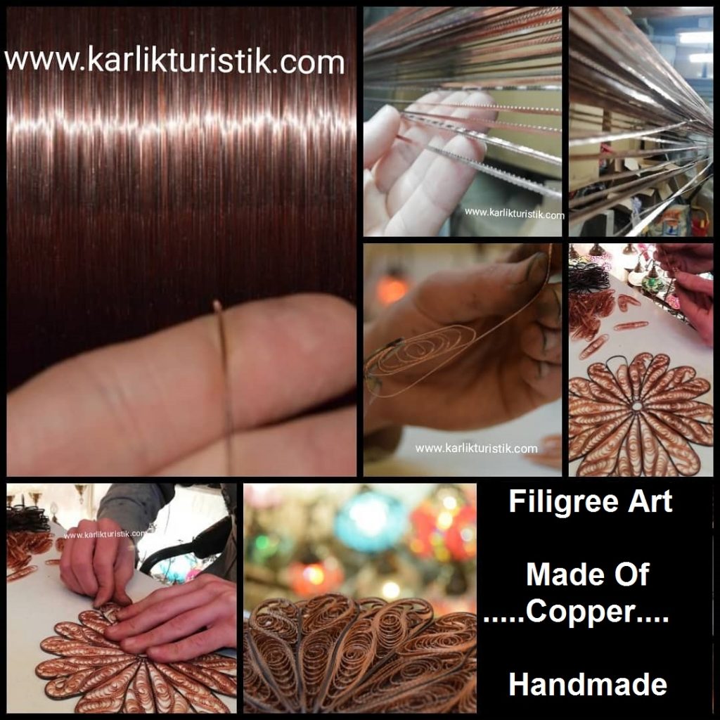 The art of filigree lamp , consists of making motifs by curling and twisting gold ,silver or copper wires and soldering these motifs. We are using 0.30 mm copper wire on this prodcuts. So you can use very long time without any color change and oxidation because of made of copper .We are doing one by one with hand . That’s why all prodcuts unique and every lamp has a storie.
